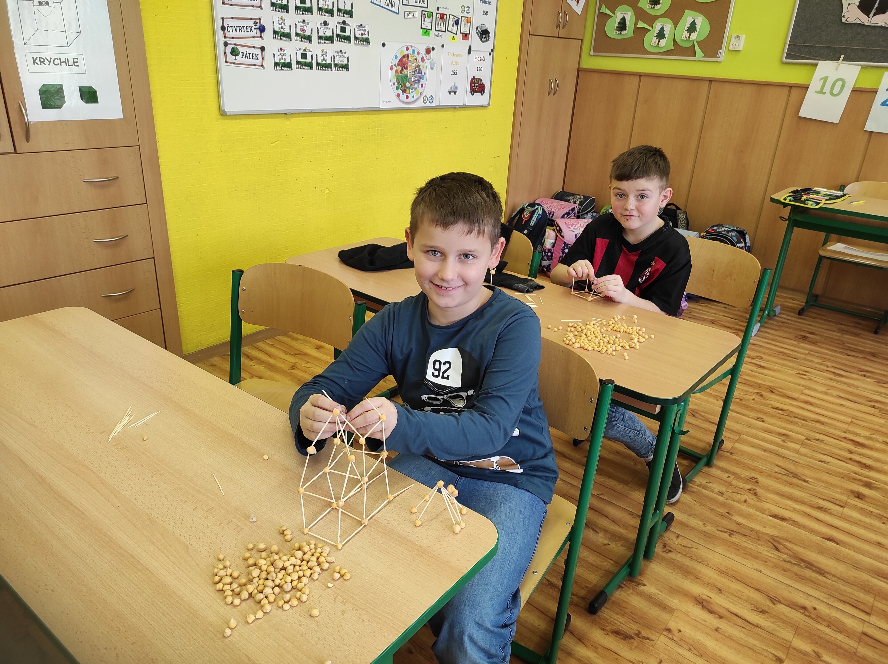 Na konci týdne, během hodiny matematiky si žáci stavěli z cizrny a párátek stavby, které jim umožnily rozvoj prostorové představivosti. Procvičili jsme tím i jemnou motoriku, která je důležitá nejen při psaní, ale i běžných každodenních činnostech. Na řadu přišlo i logické myšlení, které jim umožnilo sestavit netradiční a zajímavé stavby. Žáci tvořili domy, rakety, tělesa a ve skupině i zámek. Tvoření se jim moc líbilo a určitě jsme netvořili naposledy.