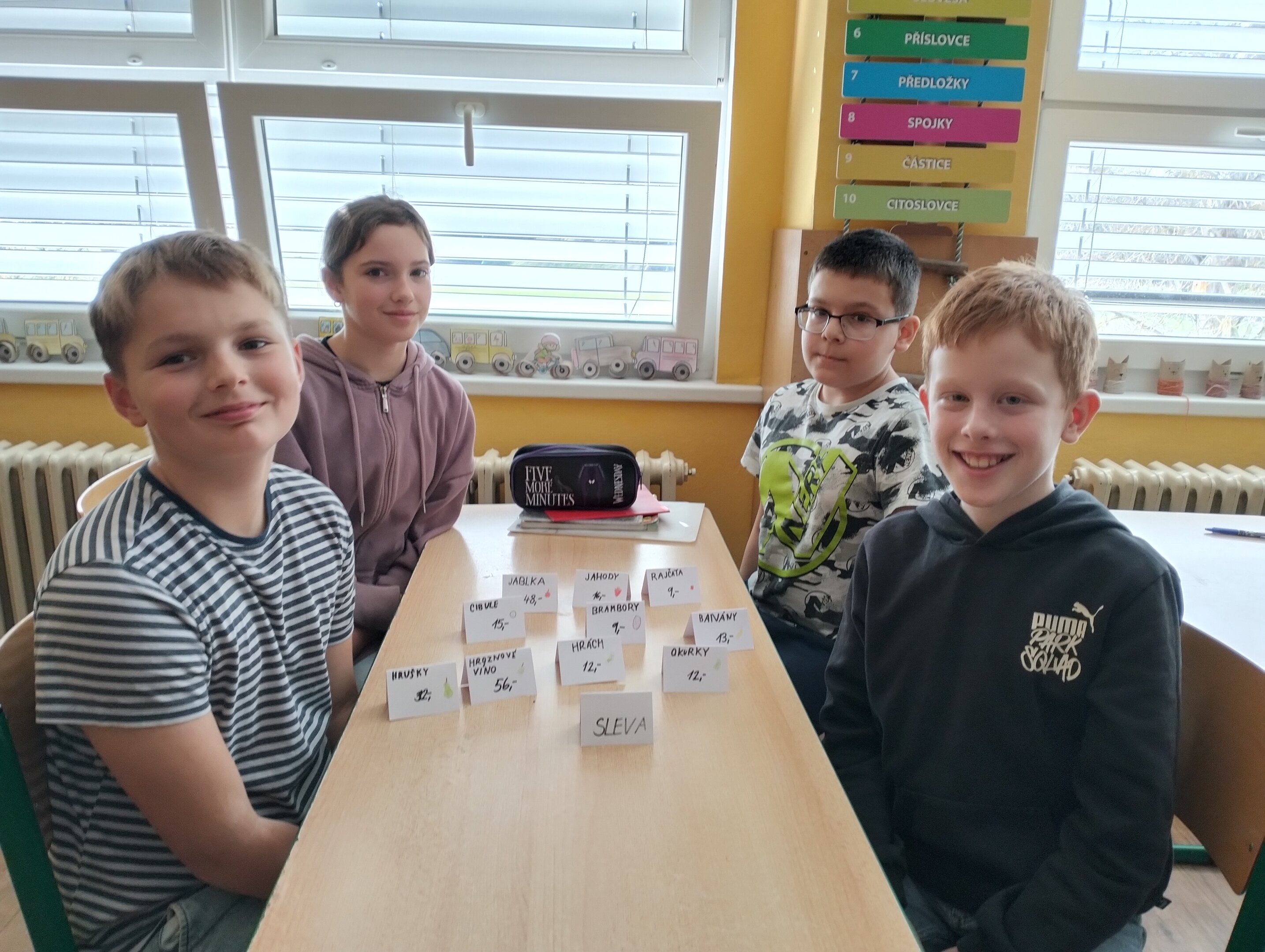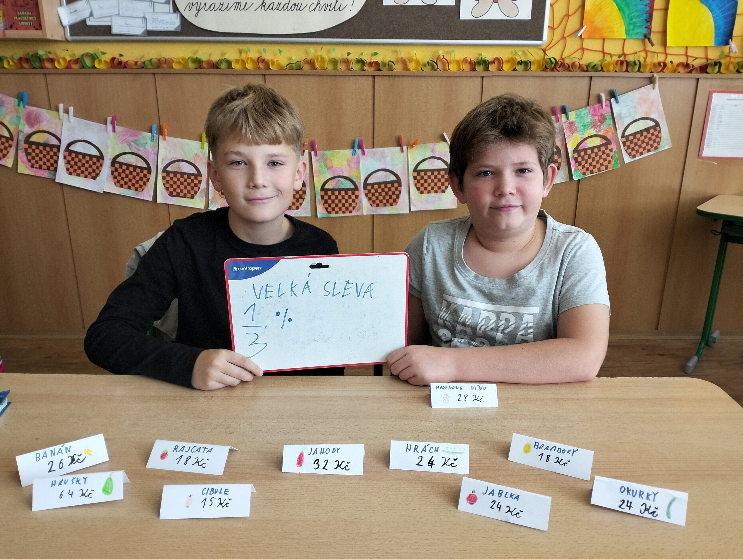 Děti se pomyslně přenesly do obchodu se smíšeným zbožím, kde počítaly slevy, jednotkové ceny zboží nebo doplňovaly tabulky s cenami ovoce a zeleniny. Zjišťovaly také, kolik zákazníci zaplatili v obchodě za své nákupy, případně kolik ušetřili. Děti při práci mimo jiné využily učivo, které právě probíráme v matematice, tedy převody jednotek a zlomky. Ve skupinách si pak navzájem zkontrolovaly výsledky své práce a společně si vyrobily cenovky zboží.