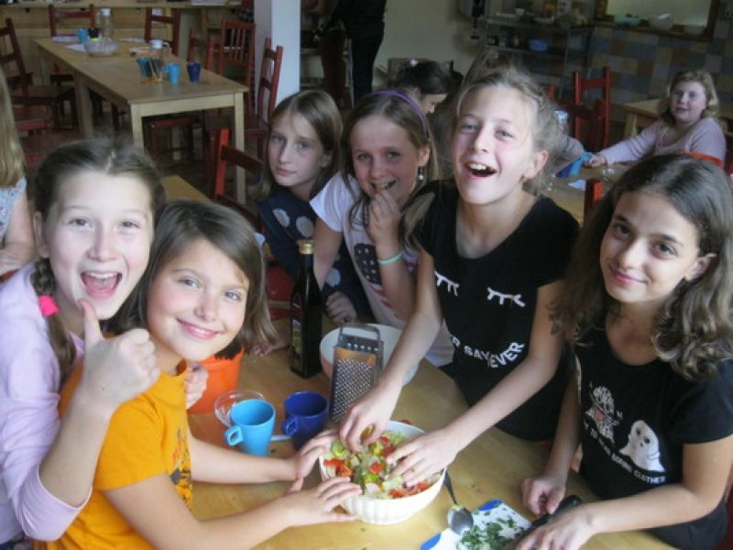 Odpoledne jsme započali programem Zdravá svačina, ve kterém se děti seznámily se základními zdravými, či netradičními druhy potravin a možnostmi jejich využití v kuchyni. V praktické části si poté připravily ve skupinách zdravý pokrm ke svačině dle vlastního výběru (zeleninové a luštěninové saláty a pomazánky, ovocné saláty, ovesné a pohankové kaše apod.).