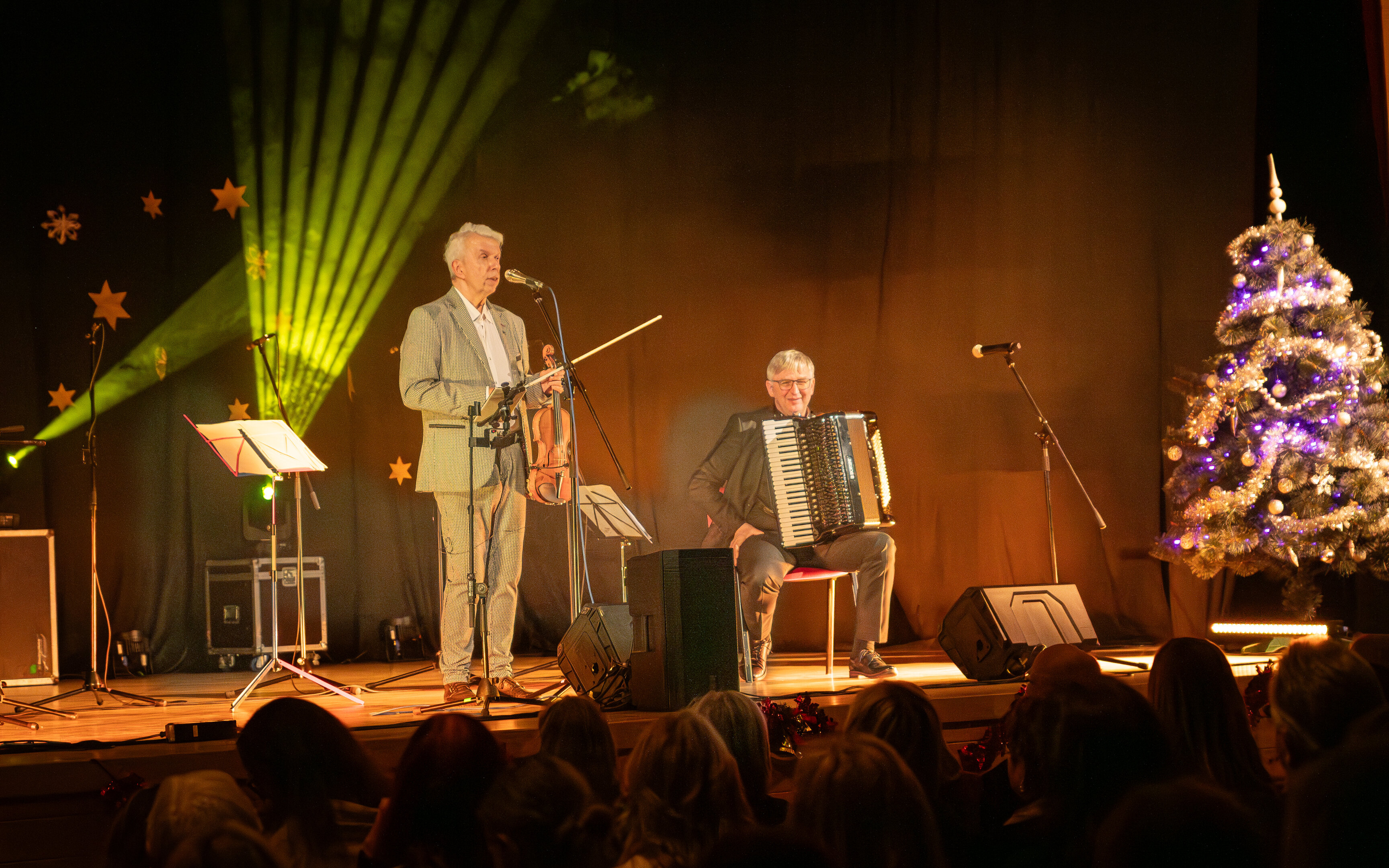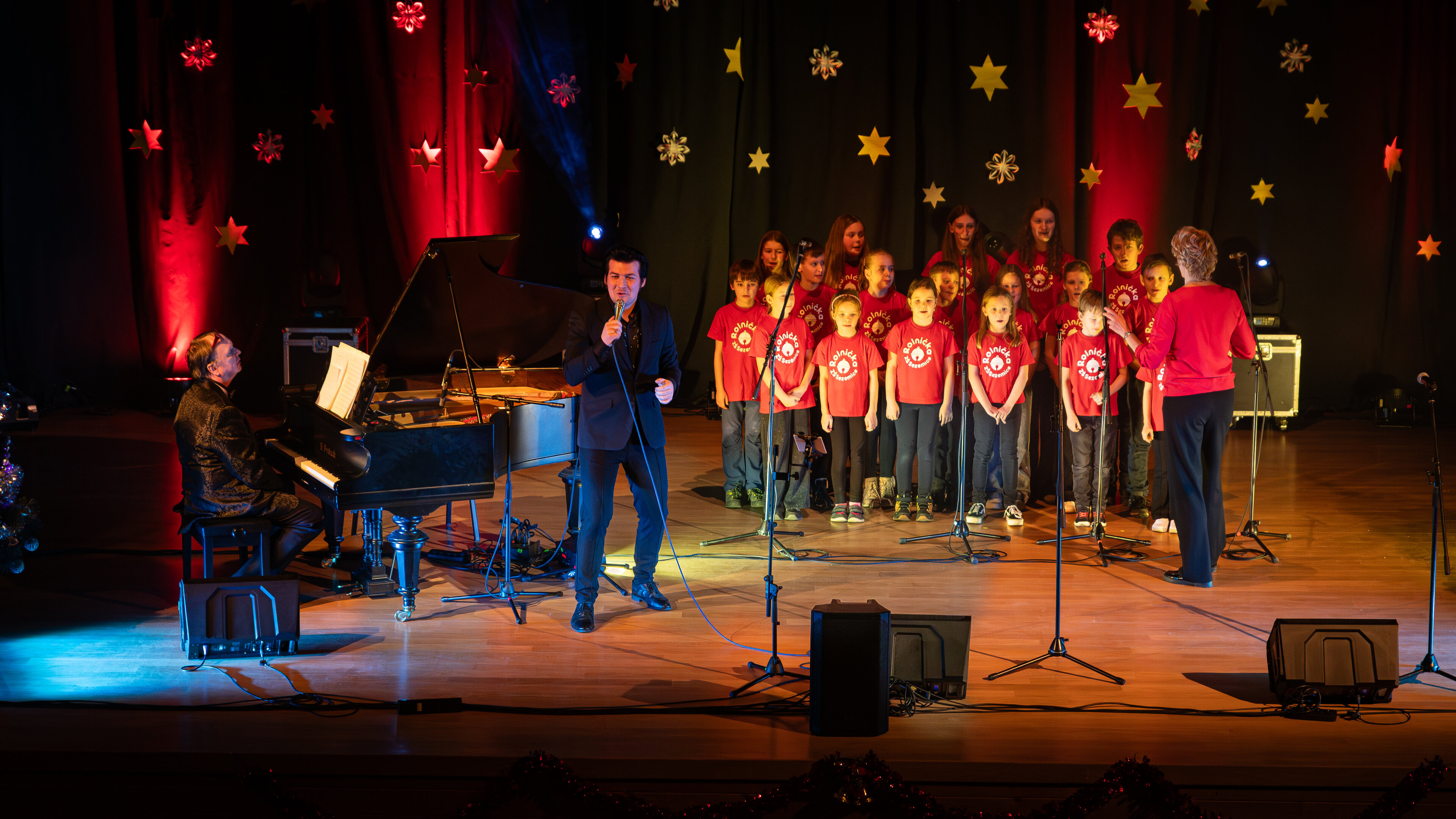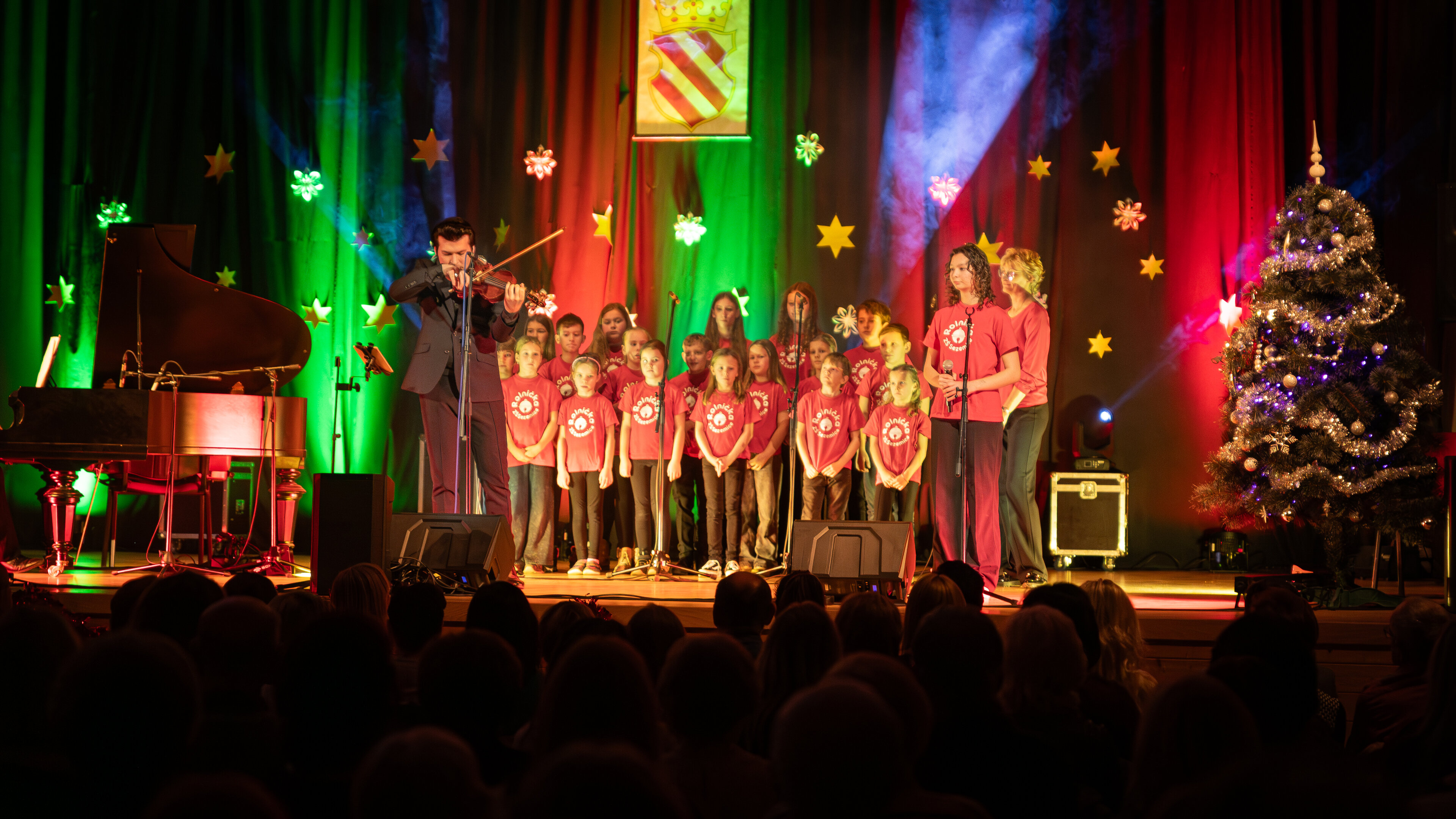 Vyslechli jsme si nádherné skladby pro housle a akordeon, vánoční melodie a písně české i světové. Sbor se přidal na začátku programu s písní Modlitba z pohádky Anděl páně a populární americkou vánoční Santa Claus Is Comin´ to Town. Poté si děti odpočinuly a vystoupily ještě na závěr koncertu s českými lidovými koledami a společně pak s celým sálem i s písní Rolničky. Spolupráce s muzikálovým zpěvákem děti nadchla a vše zvládly na výbornou, i když to nebylo vůbec jednoduché. Díky patří také obecenstvu, které všechny ohromně podporovalo a odměnilo bouřlivým potleskem.