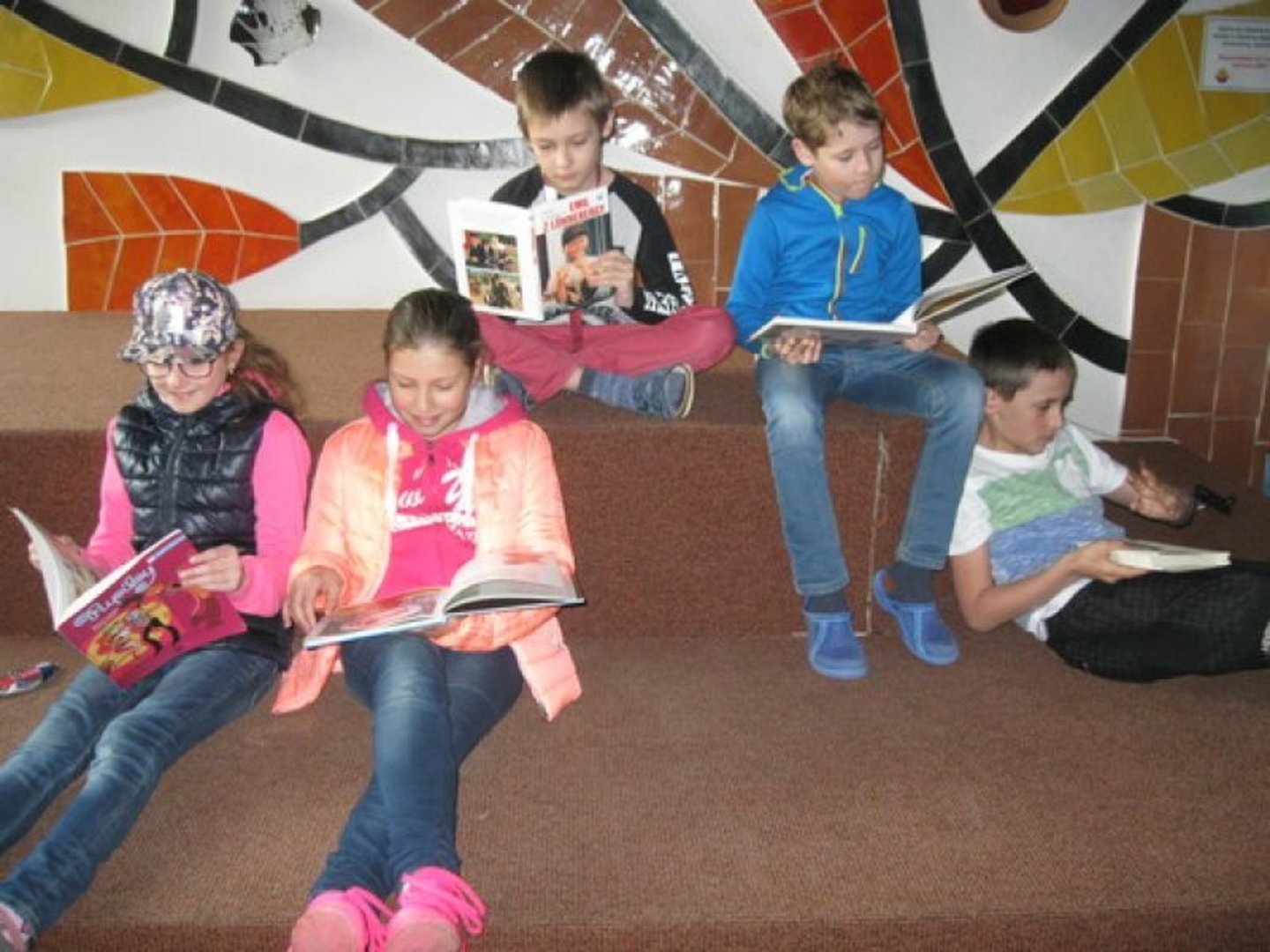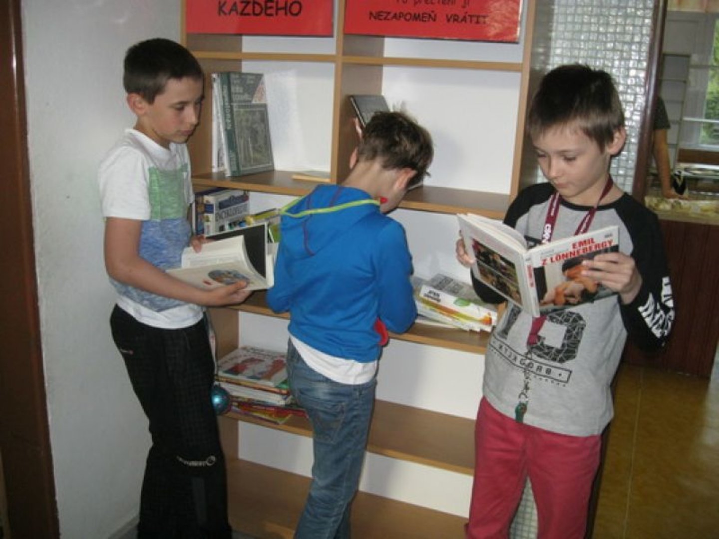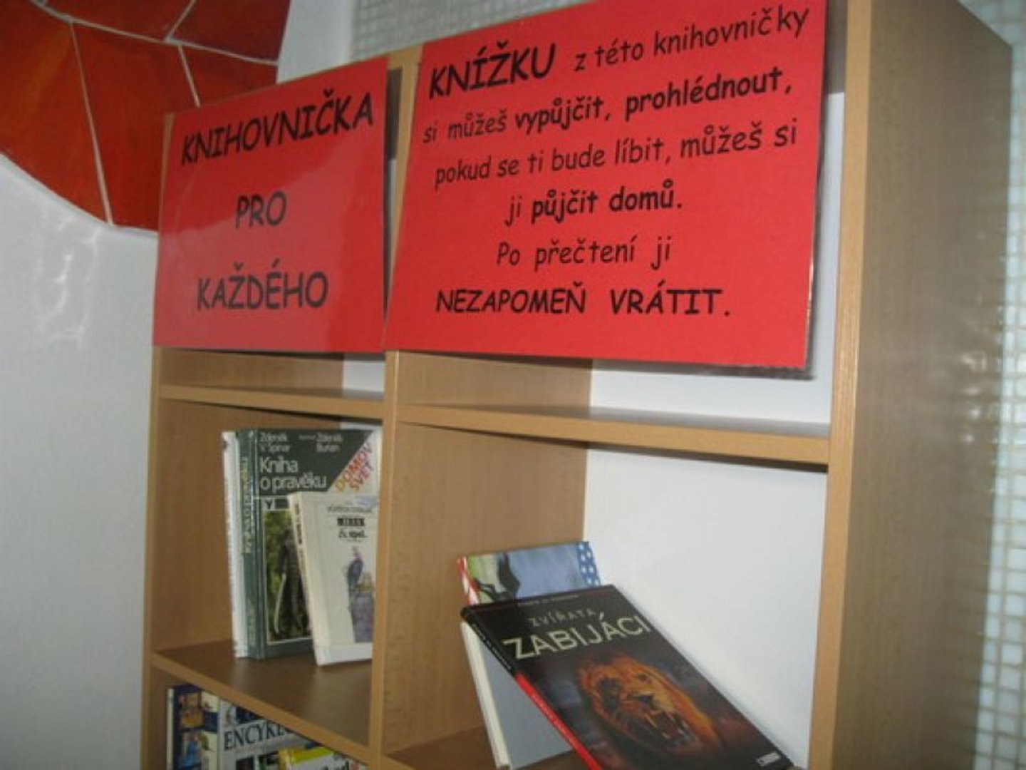 Žáci si zde mohou půjčovat knížky pro domácí čtení. K dispozici jsou navíc sady knih pro celé třídy, které jsou využívány pro společnou četbu v rámci hodin čtení. Některé z nich (např. edice Čti+) lze použít pro práci s textem v hodinách českého jazyka, komunikačních dovedností, prvouky, vlastivědy či přírodovědy. Knihy si dle své potřeby půjčují i učitelé a paní vychovatelky. K tomu všemu máme od měsíce března novinku – KNIHOVNIČKU PRO KAŽDÉHO. Bylo pro ni vybráno místo s největší frekvencí pohybu žáků – u vchodu do jídelny poblíž podia, které je žáky využíváno během přestávek, o poledních pauzách a v době čekání na kroužky a autobusové spoje. Děti si tedy mohou prohlížet knížky, povídat si o nich s kamarády a pokud je kniha zaujme, mohou si ji půjčit domů. Doufáme, že knihovnička se setká s ohlasem a bude našimi čtenáři využívána.