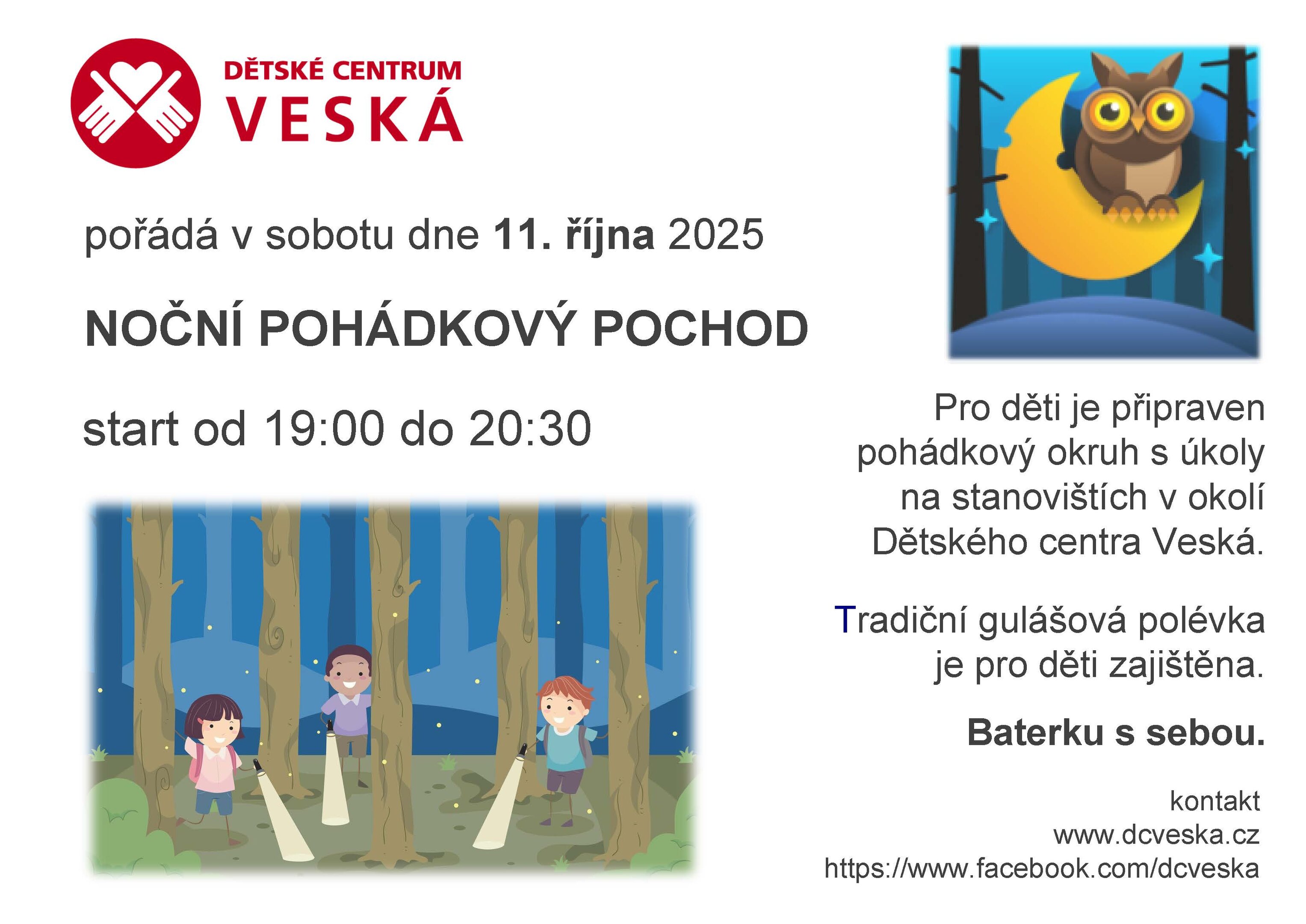 V sobotu 11. 10. 2025 se konal další z nočních pohádkových pochodů, které pořádá DC Veská. Naše škola pomáhá se zajištěním této akce zajištěním dobrovolníků z řad našich druhostupňových žáků, kteří se ochotně převlékají do masek pohádkových postav a rozdávají malým soutěžícím úkoly.