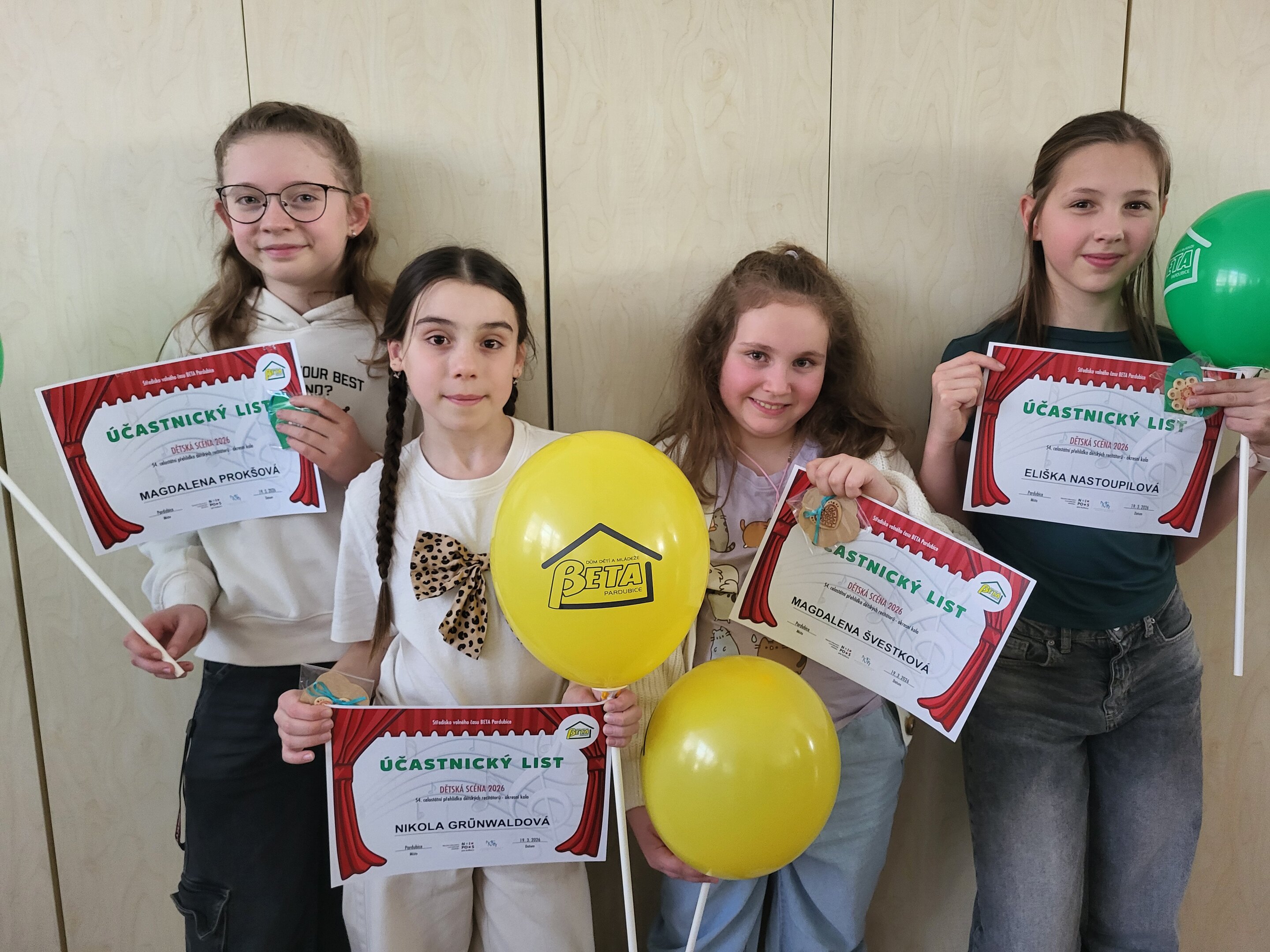 Za I. kategorii to byly Magdalena Švestková (3. C) a Nikola Grünwaldová (3. A), ve II. kategorii pak Eliška Nastoupilová (5. B) s Magdalenou Prokšovou (5. A). V letošním roce byl přihlášen mimořádně vysoký počet recitátorů a konkurence byla tedy značná. Děvčata ale nedovolila, aby je ovládla tréma a všem se vystoupení před porotou a diváky povedlo. Recitace Nikolky Grünwaldové zaujala porotu natolik, že rozhodla o jejím postupu do krajského kola.