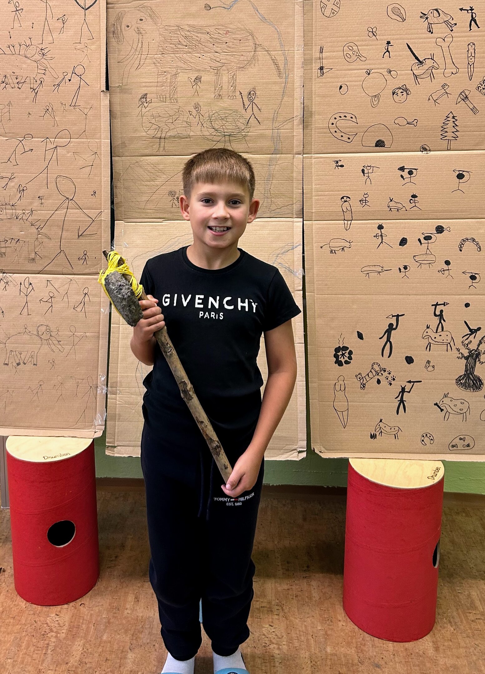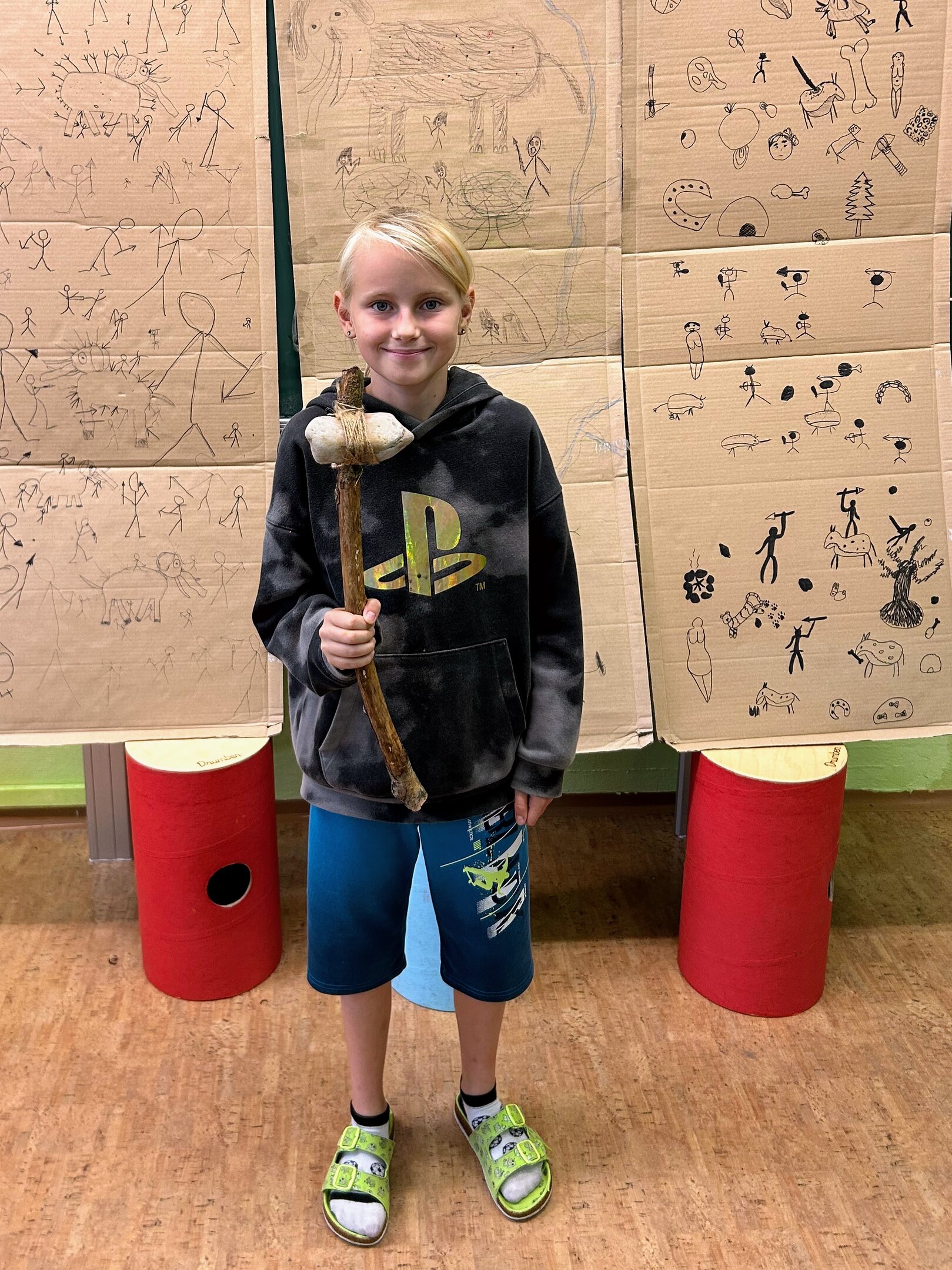 V letošním školním roce se děti poprvé setkávají s výukou dějepisu a téma pravěk je pro ně velice zajímavé. Děti si vyrobily nástroj nebo nádobu, kterou mohli používat lidé v době kamenné. Zkusily si, stejně jako pravěcí umělci, vyzdobit své obydlí jeskynními malbami. Na závěr projektu se pravěcí lovci z 5. B sešli kolem ohýnku a zazpívali si písničku Vzpomínka na pravěké doby, kterou se naučily při hudební výchově.