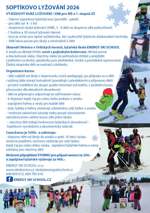 V letošním školním roce opět proběhne výjezdový lyžařský kurz pro žáky 1. stupně. Výuku zajistí ve skiareálu Olešnice v Orlických horách lyžařská škola ENERGY SKI SCHOOL. Bylo spuštěno online přihlašování. Více informací se dozvíte v článku.