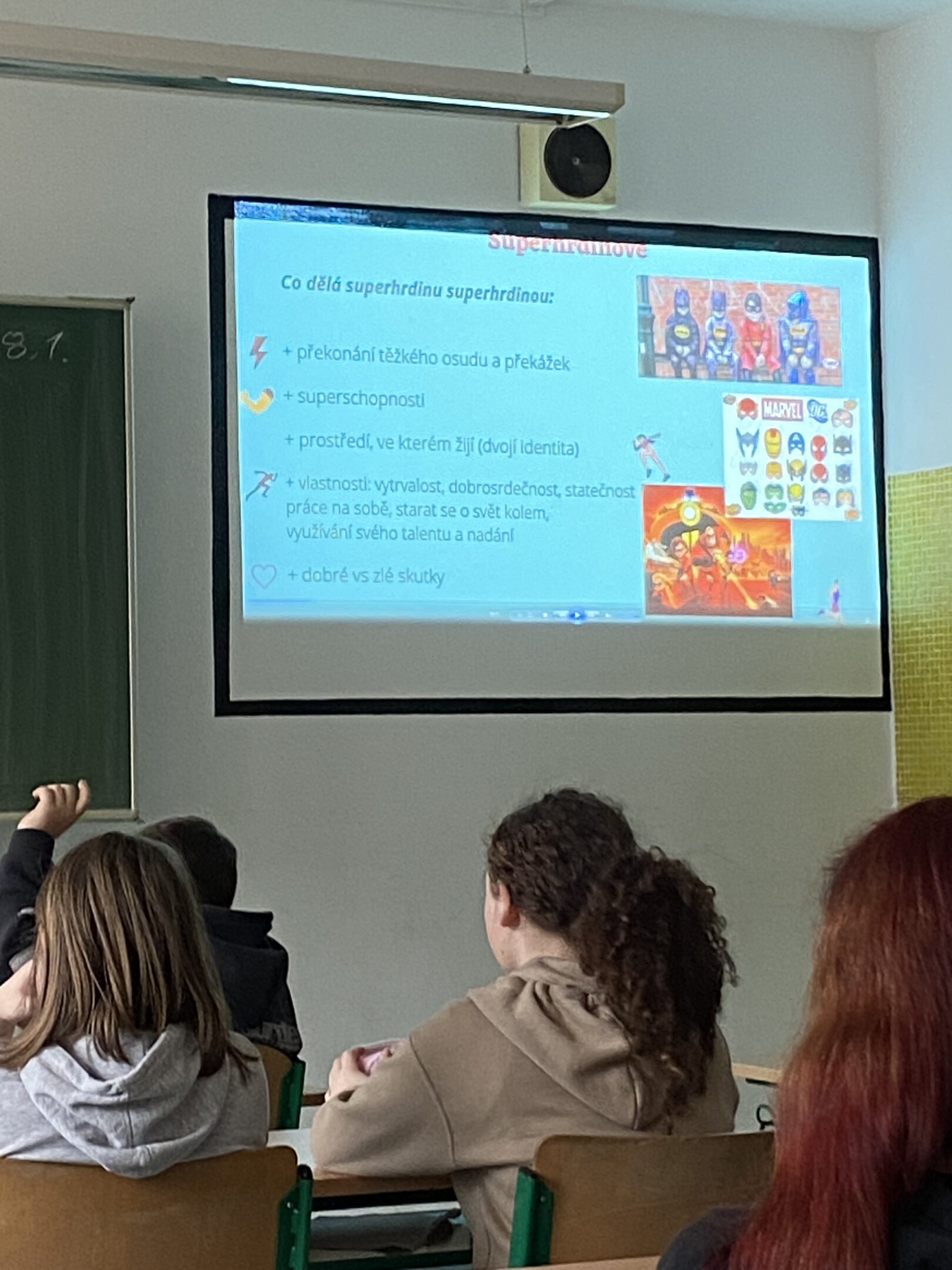 Kdo jsou to vlastně superhrdinové a jaké mají schopnosti? Kde se vyskytují? Můžeme je potkat v běžném životě? A známe je vůbec? Takové otázky nám kladla v rámci literární besedy paní lektorka. Žáci se seznámili s knihami i filmy, kde se superhrdinové vyskytují, a viděli jejich vývoj v čase. Některé znali, jiní jim byli povědomí, s některými se ještě nesetkali. Vytvořili si vlastního superhrdinu podle své fantazie.