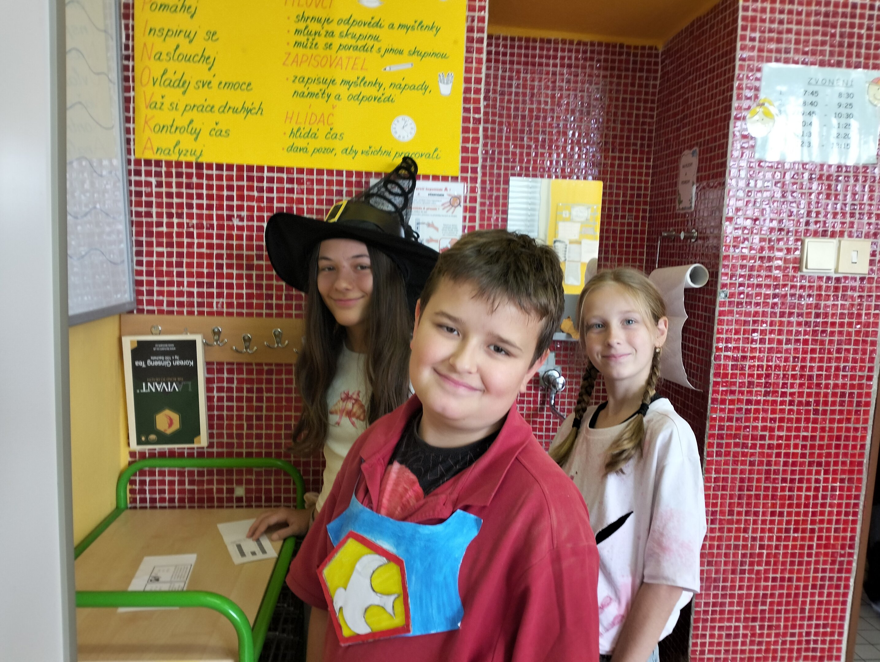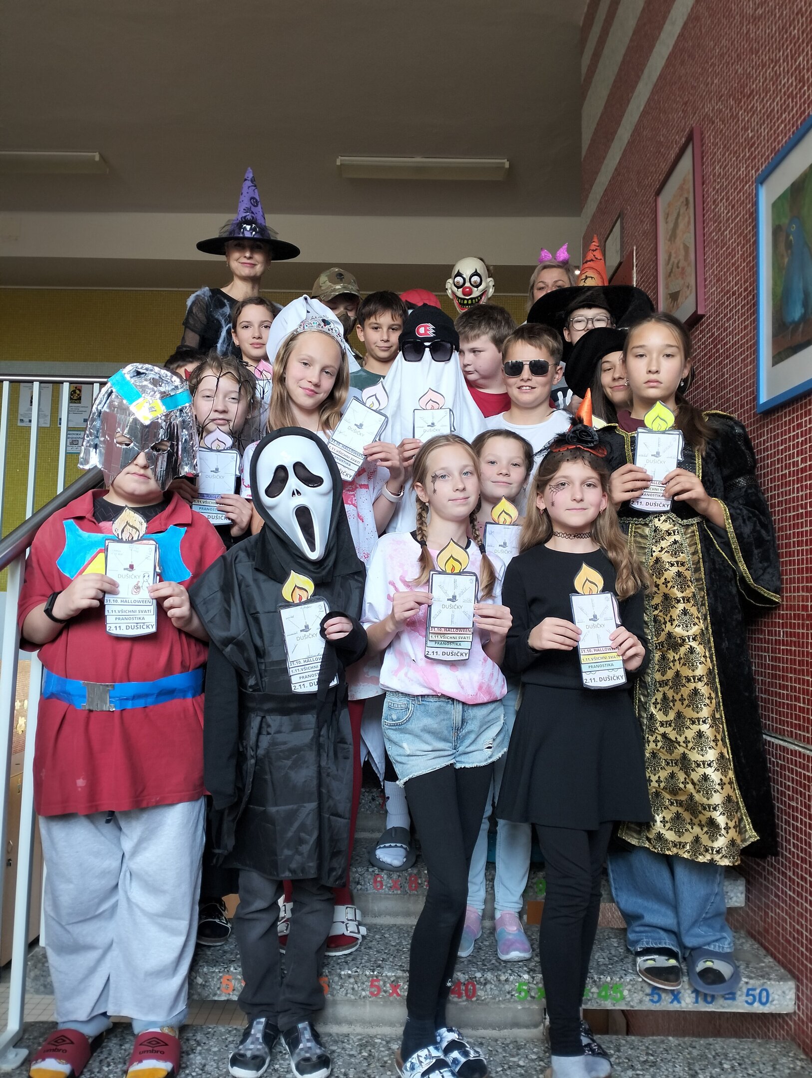 Poslední říjnový den se škola proměnila v místo plné strašidel, dýní a zábavy. Čtvrťáci a páťáci přišli v nápaditých kostýmech duchů, čarodějek, kostlivců i dalších příšerek.
