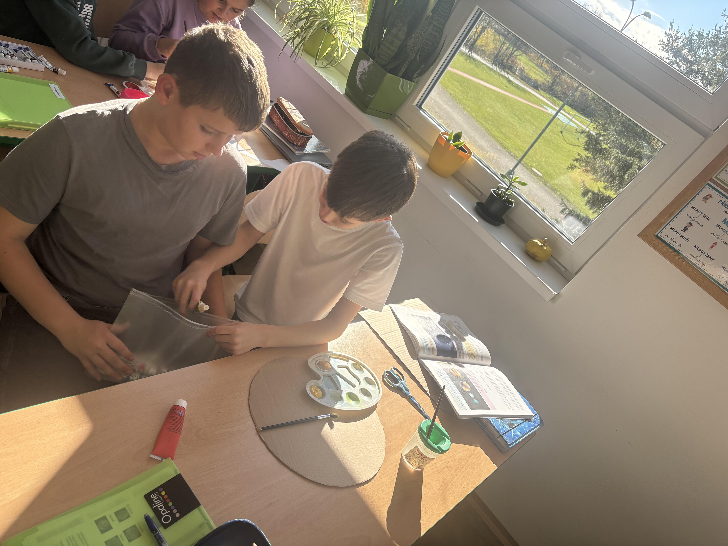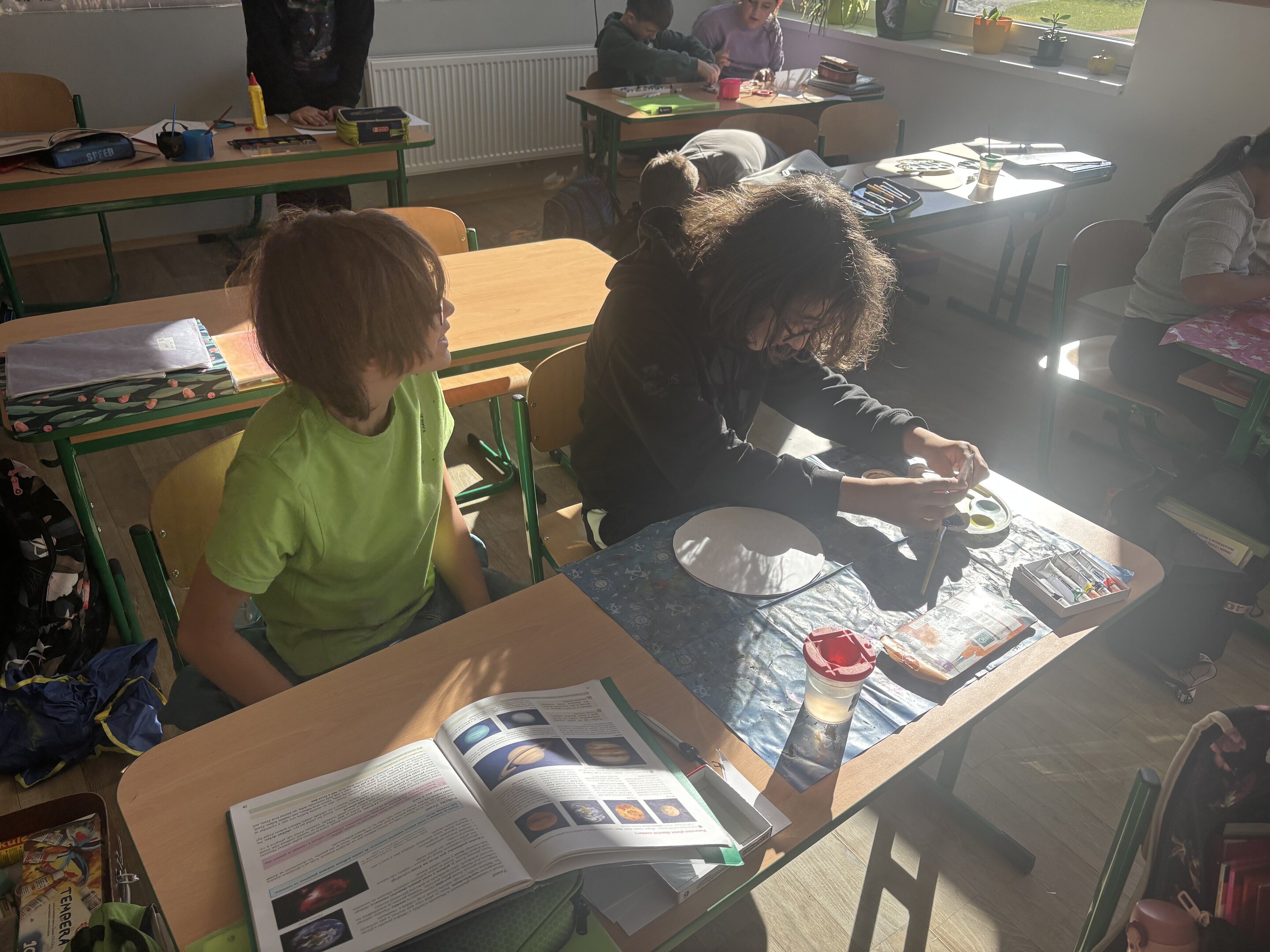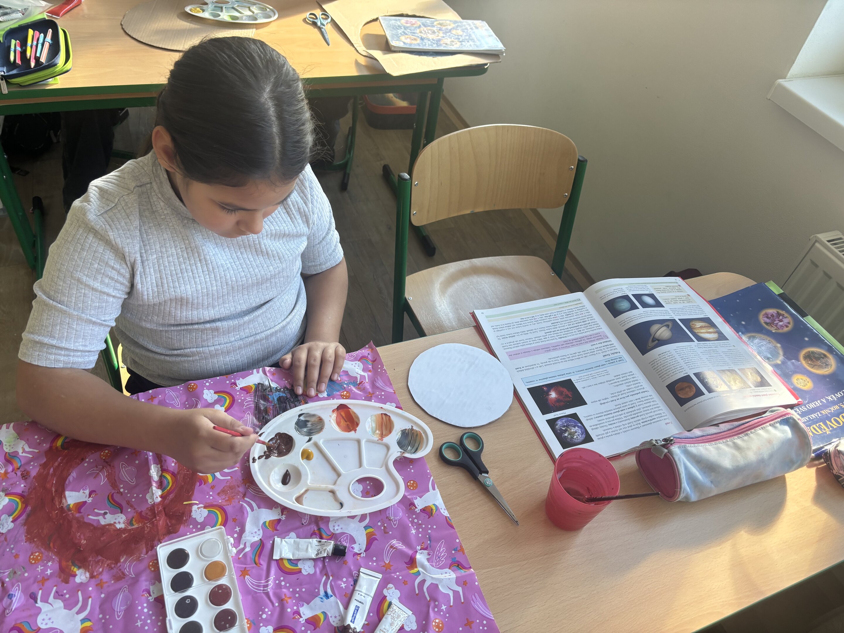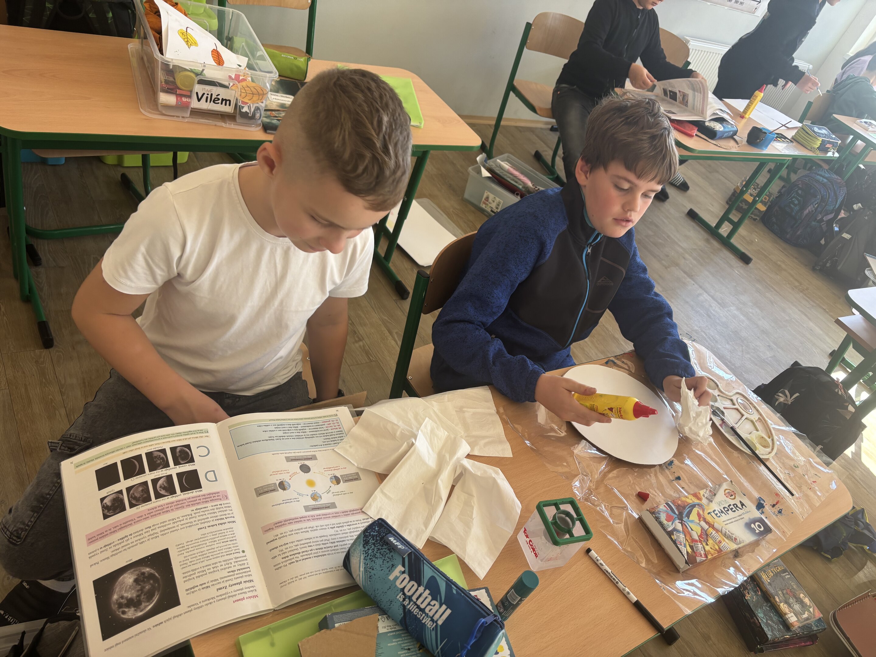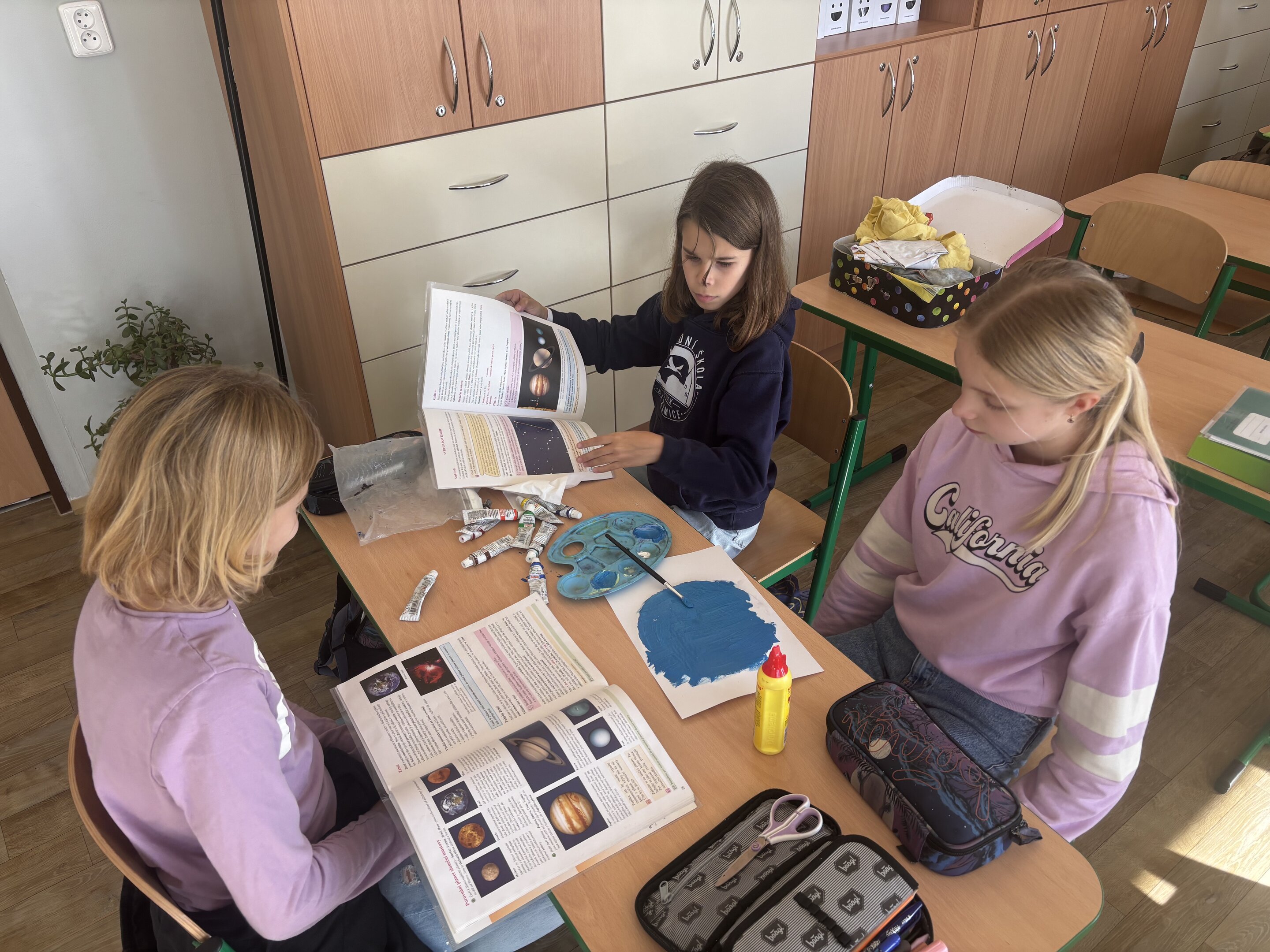 V hodině přírodovědy si každá skupina si zvolila jednu planetu, o které se chtěla dozvědět více. Nejprve jsme si řekli potřebné informace – jak je planeta velká, z čeho se skládá, jaká je tam teplota nebo zda má měsíce. Poté se děti pustily do samotné výroby. Použily papírové kruhy, barvy, papír lepidlo a vše, co bylo potřeba. Každá planeta tak získala svou vlastní podobu.