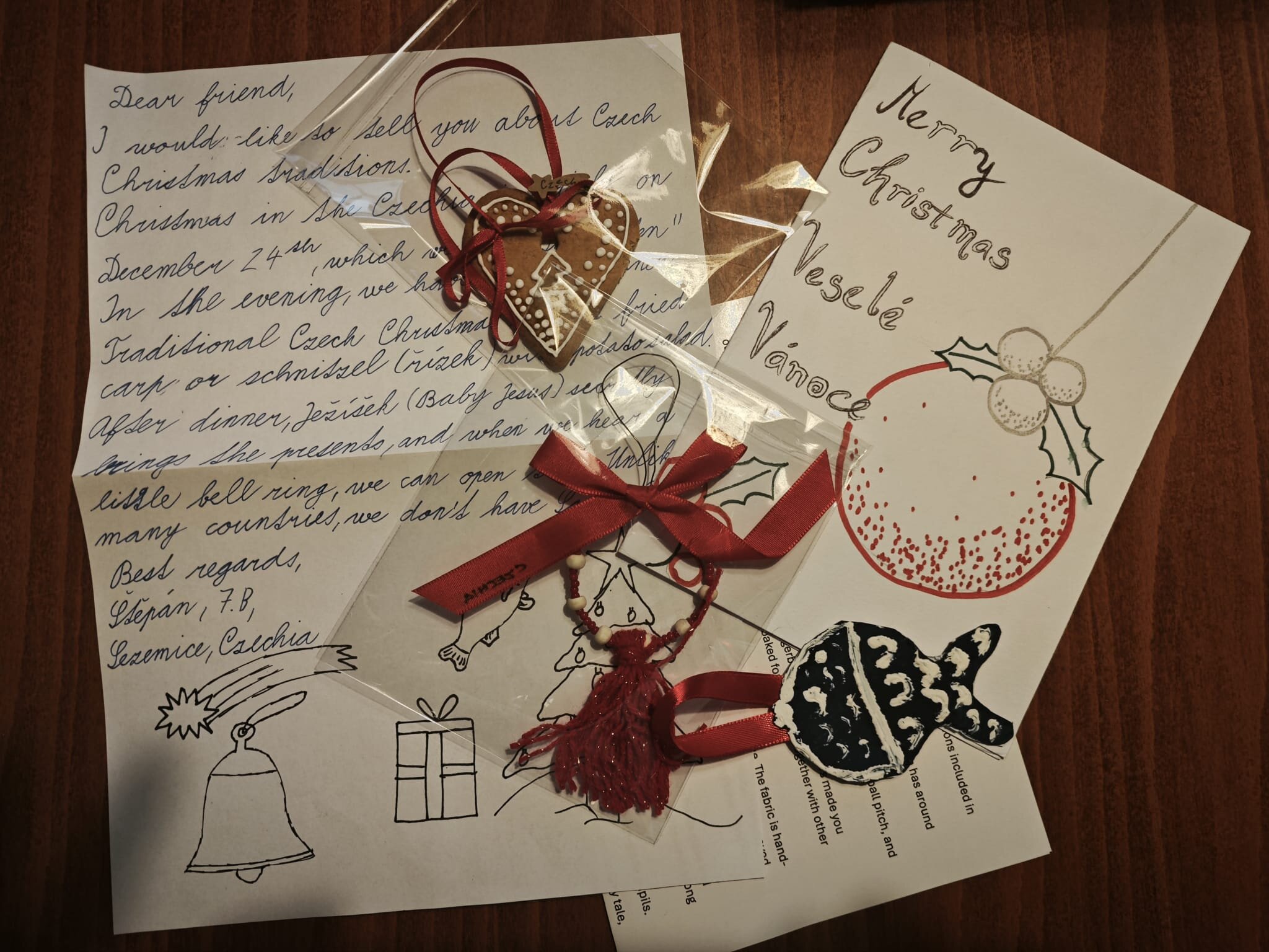 Zatímco se žáci pátého ročníku s paní učitelkou Šimkovou pustili do pečení a zdobení perníčků, sedmáci vyrobili v hodinách výtvarné výchovy s paní učitelkou Richterovou modrotiskové ozdoby a ozdoby z korálků. V hodinách angličtiny zase zpracovali kvalitní texty v osobním dopise adresovaném kamarádům do zahraničí. V dopise naši žáci vykreslili tradiční české vánoční zvyky, jakými jsou například štědrovečerní večeře, čekání na Ježíška, krájení jablka a další.