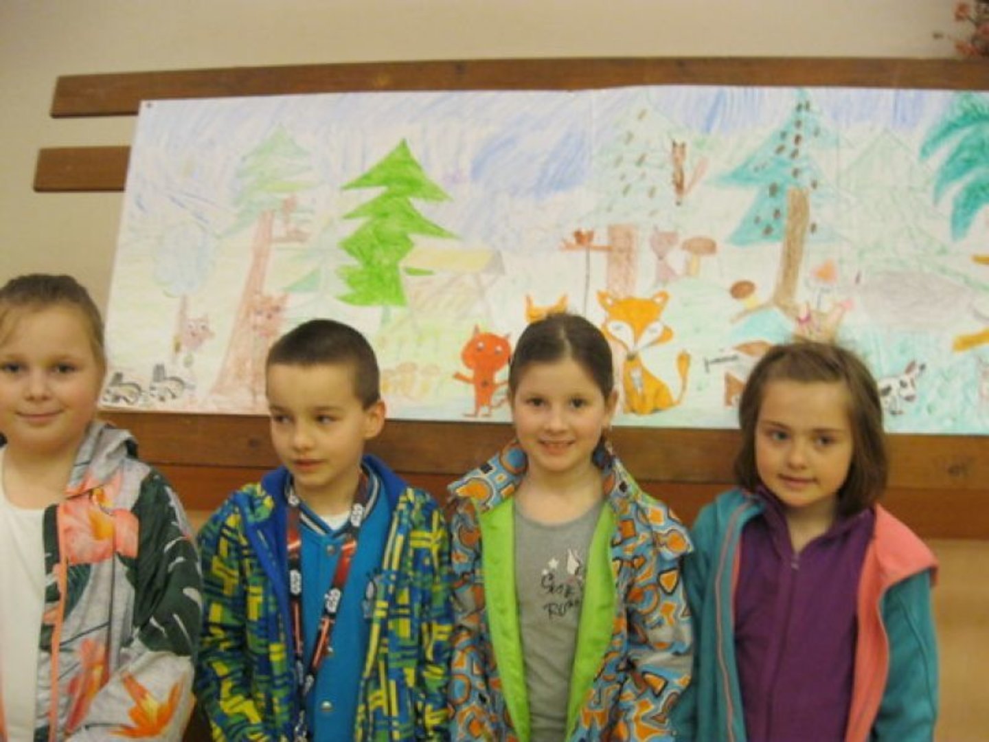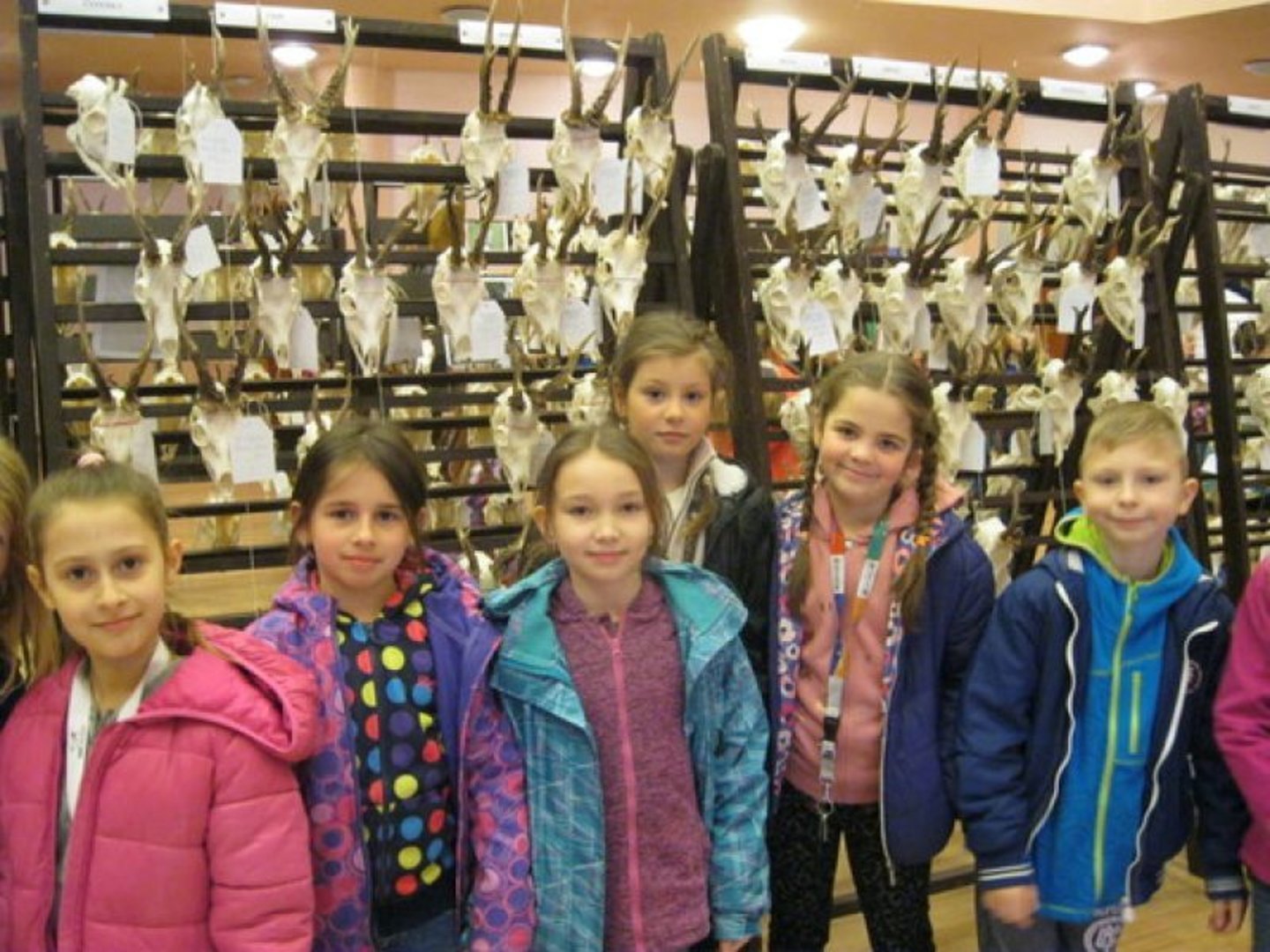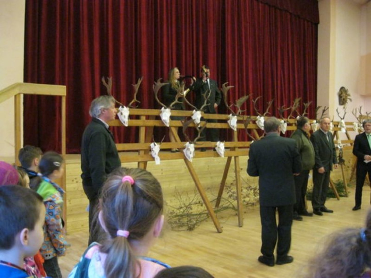 Prohlédli si zde trofeje srnců, daňků i jelena a prozkoumali různorodé tvary paroží. Výstavu doplňovaly výtvarné práce žáků naší školy. Vyslechli si také slavnostní zahájení celé výstavy, jehož součástí byly i fanfáry lesních rohů a myslivecké písně.
