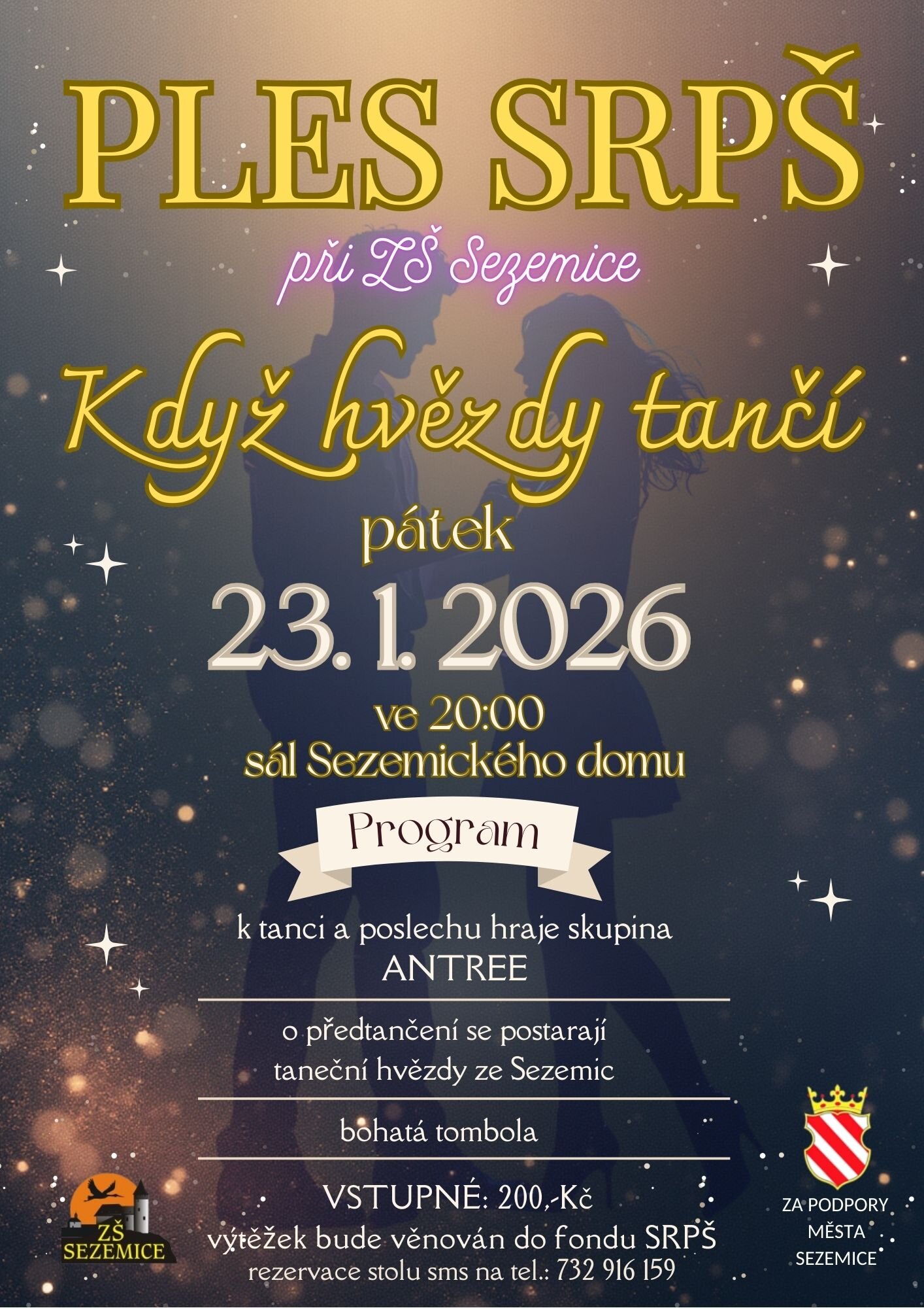Na plese s podtitulem Když hvězdy tančí se můžete těšit na skupinu Antree, předtančení a bohatou tombolu. Výtěžek plesu bude věnován do fondu SRPŠ.