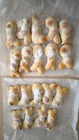 K Velikonocům patří pečení, tak jsme se tentokrát pustili do jidášů a velikonočních zajíčků z tvarohového nebo listového těsta. Nejenom že to krásně vonělo, ale ještě víc nám to chutnalo. Jsme opravdu šikulky ...:))